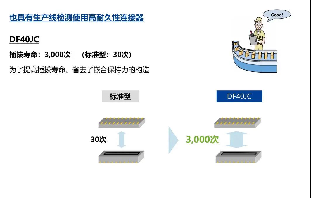 7. 种类繁多(带护罩:DF40G系列,带完全锁:DF40GL系列,ADAS:DF40T系列) 8.核心数量从10到120核心变化巨大 9.用导向肋确保自动对准:0.33mm 10.防止镍阻挡层焊接的结构 11.还提供用于生产线检查的高度耐用的连接器* 只有H=1.5 mm的产品支持Type-C