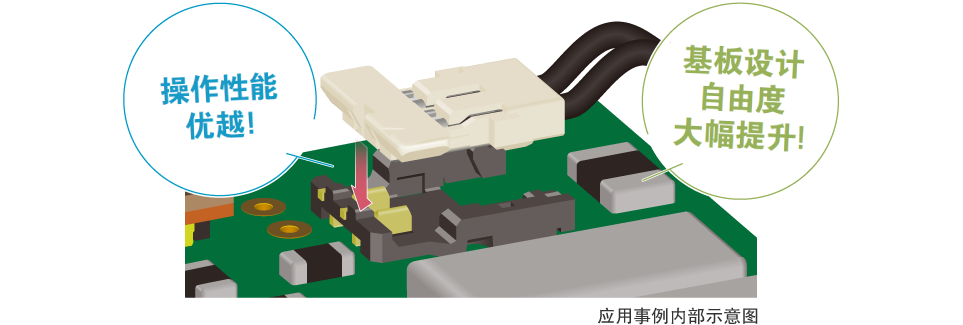垂直嵌合不影响其他元器件,有效节省空间,提高基板设计自由度。采用从上向下的嵌合方式,易于确认嵌合口,从而更好地确定插